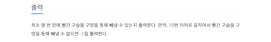 상하좌우 중 한 방향으로 굴릴 때에는 두 구슬이 벽에 닿거나 빨간 구슬이 구멍에 들어가는 등 더 이상 구르지 못할 때까지 굴립니다. 굴린 횟수가 총 10이 넘으면 -1을 출력하고 종료합니다.