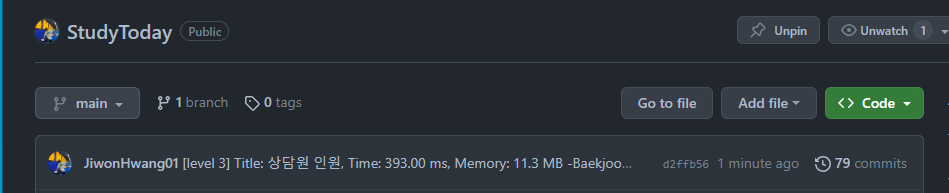 백준에서 문제가 정답일 경우 맞았습니다!! 텍스트 옆에 초록색 체크 표시가 뜹니다. 초록색 표시는 커밋이 정상적으로 완료되었다는 뜻입니다. 깃허브에 접속해 보면 아래와 같이 확인할 수 있습니다.